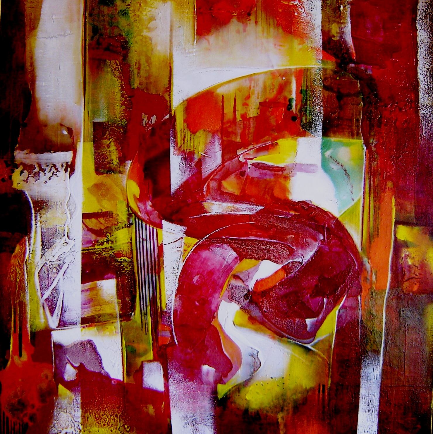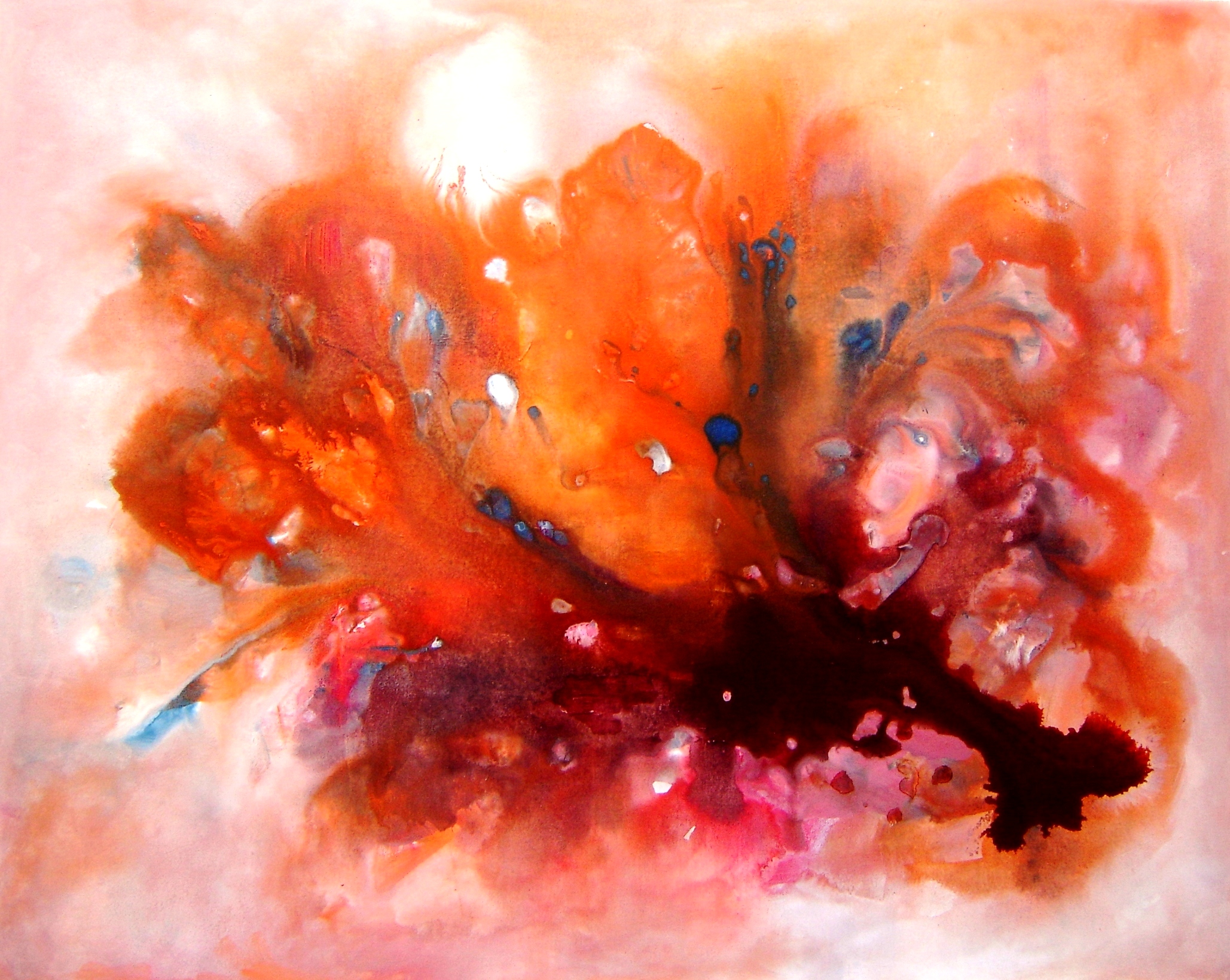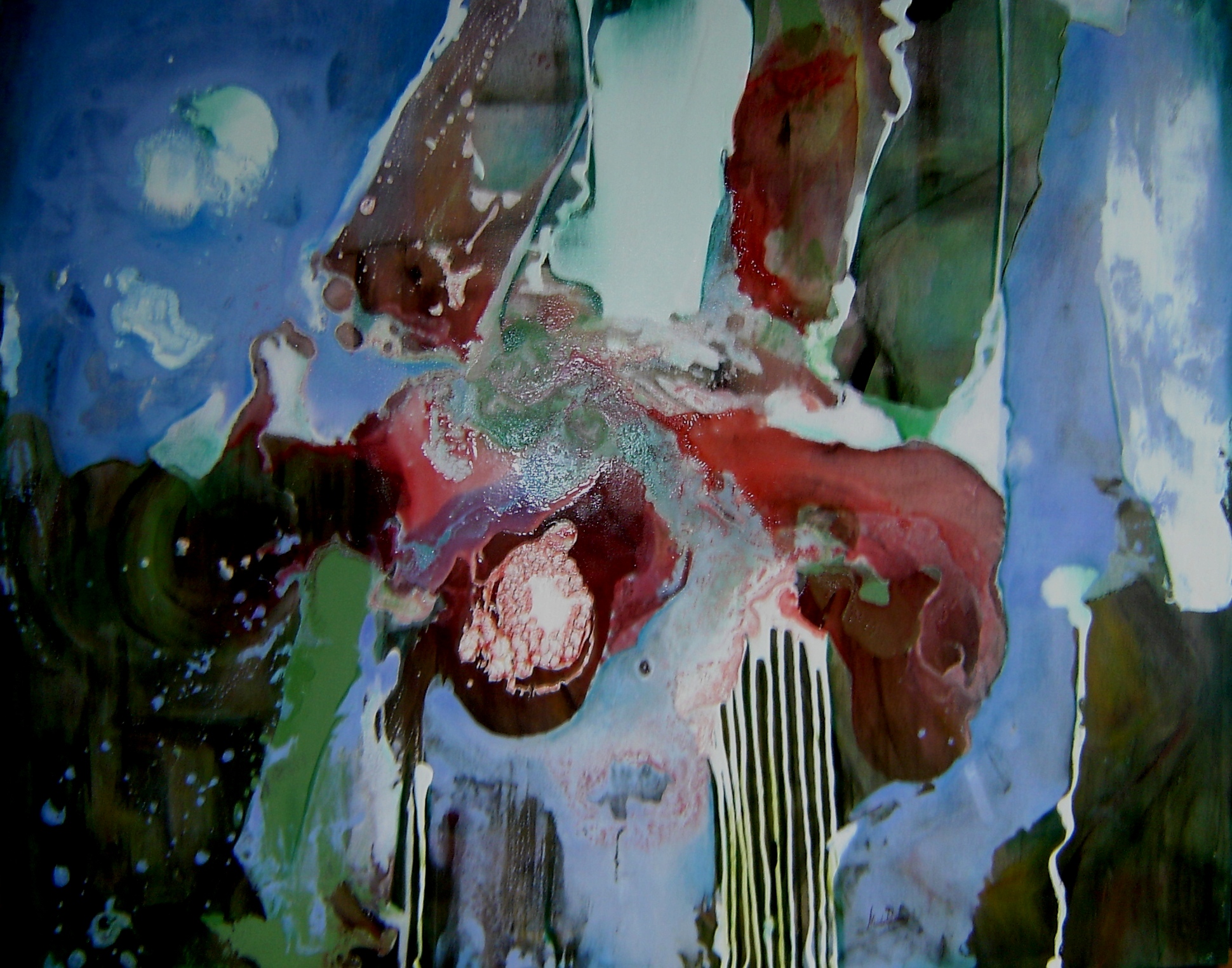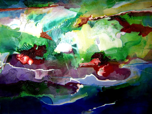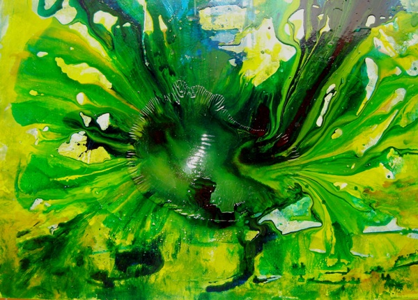 Trabalhos abstratos e com cores vibrantes, feitos utilizando verniz e tinta acrílica para obter formas e texturas brilhantes e fluidas.
